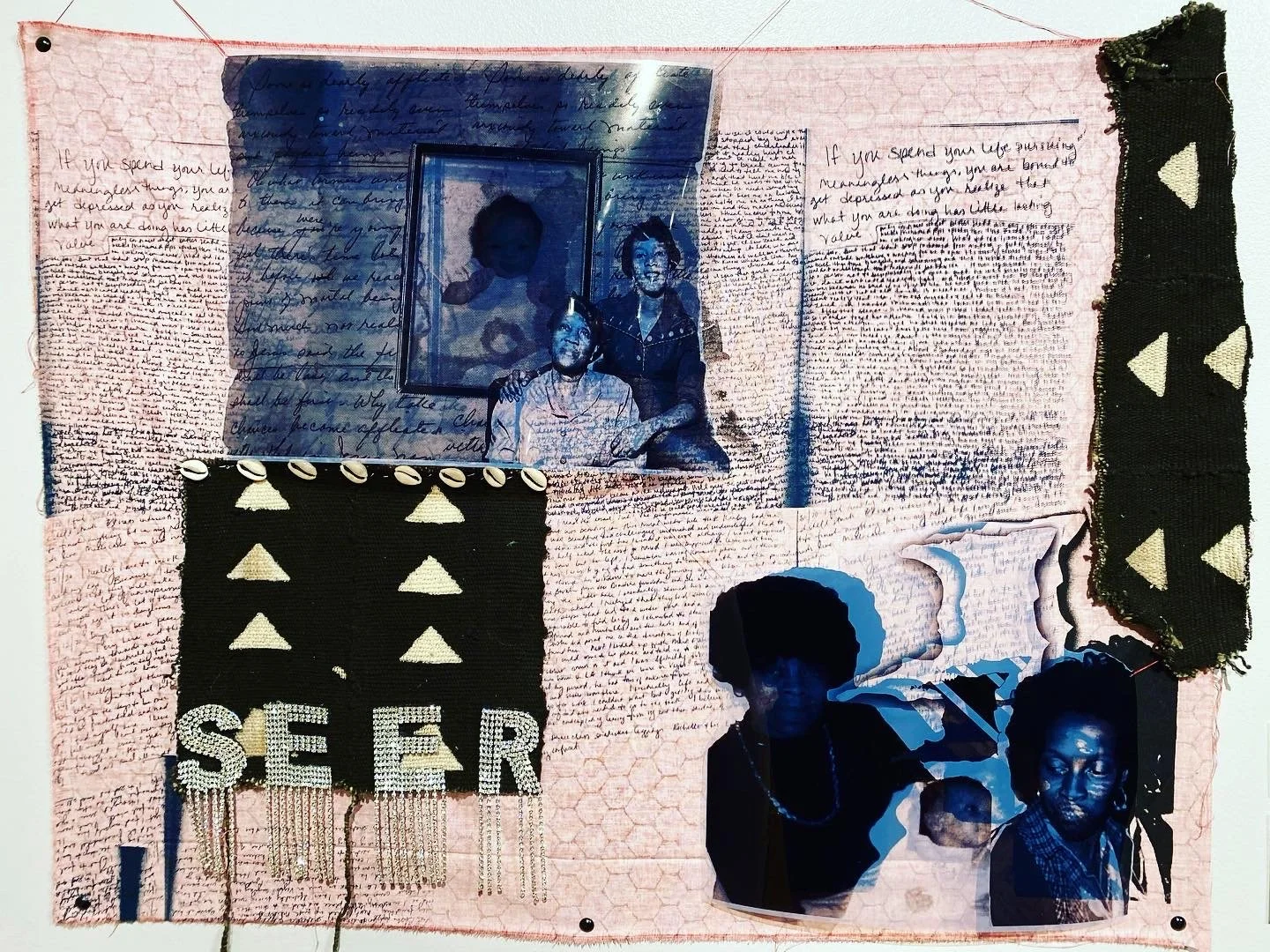 Seer//Both Sides by Sharayna Ashanti Christmas. Meta, Para Lee, Josephine, Mae a fostering vigilant nurturer. Screen print on cotton Mud cloth Film (2022).